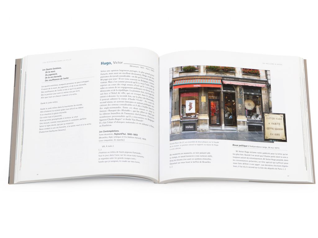 Une statue colossale pour l’un, une modeste plaque commémorative pour l’autre, parfois une fresque. Parmi ces célébrités figurent de nombreux écrivains, de Belgique et du monde entier. Les écrivains dans la ville fait partager un plaisir de lecture et de promenade au cœur de la capitale, mais hors des parcours habituels. Entre abécédaire, anthologie et guide, il se veut l’outil de découverte au service du texte, de la langue et de la poésie saisis dans leur lien singulier avec Bruxelles. Il brasse tous les textes, connus ou moins connus, parfois sacrés, l’œuvre immense, les écrits rares, les notes et les correspondances, sans limite d’espace ou de temps, mais toujours reliés à l’imaginaire unique de chacun des auteurs auxquels la ville rend hommage.