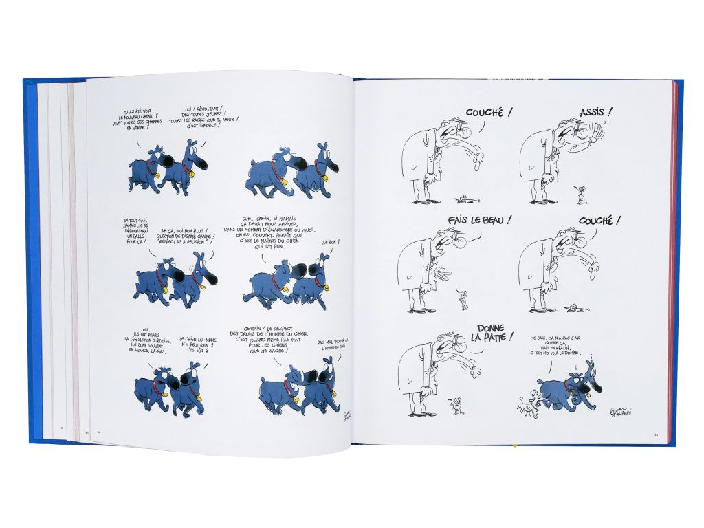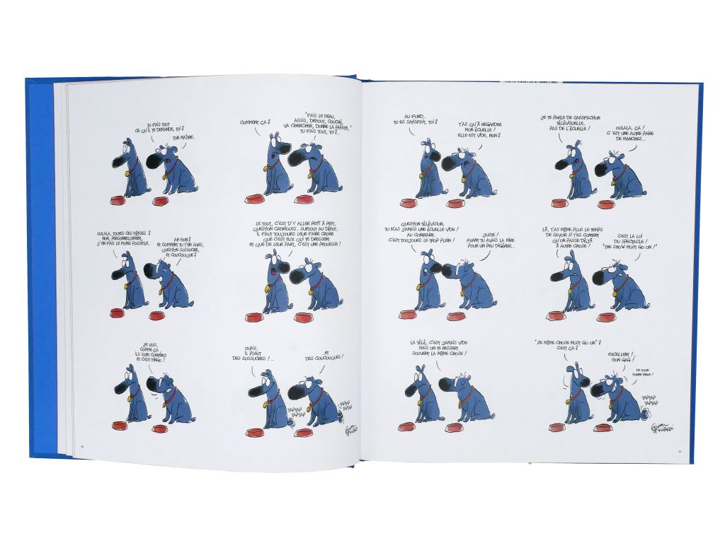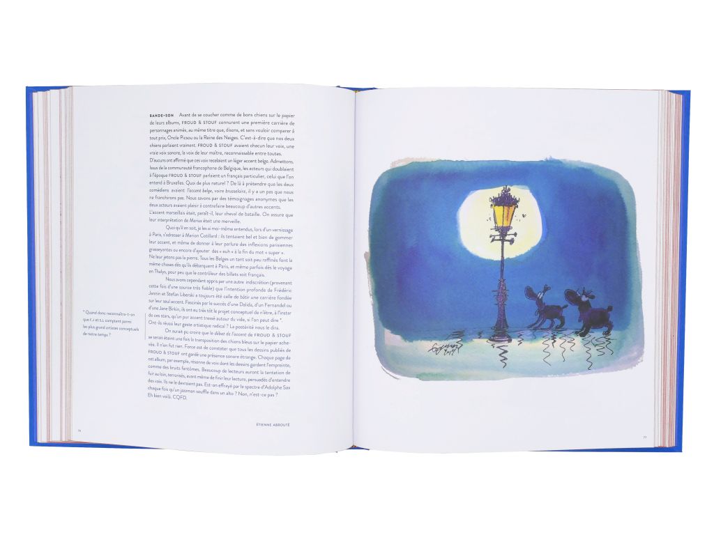 Froud et Stouf sont deux petits chiens bleus (un peu) philosophes à l’allure sympathique et débonnaire créés par Frédéric Jannin (dessins) et Stéphane Liberski (scénario). Froud et Stouf conversent et portent un regard amusant et amusé mais toujours pertinent sur le monde qui les entoure. Deux albums de bande dessinée sont sortis par le passé, il était temps de rendre à nouveau disponible les discussions décalées et drôles de nos chiens belges dans une édition qui leur rend hommage. Ce volume reprend la plupart des planches déjà parues dans Les gens adorent et Waf waf auquelles s’ajoutent les planches parues dans Spirou et ailleurs ainsi que de nombreuses planches inédites.